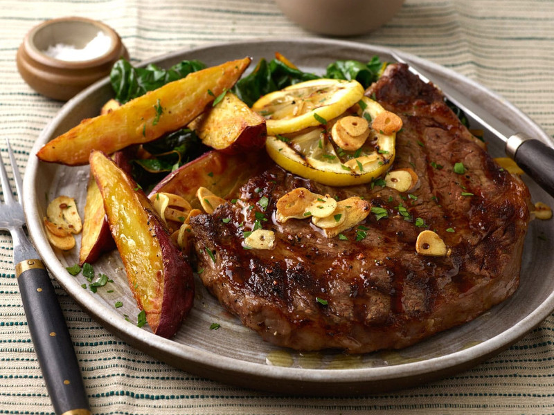 Served with pumpkin mash and baby vegetables and confit tomatoes and beef jus