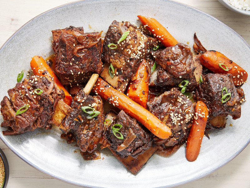 served with pumpkin mash and baby vegetables and confit tomatoes and beef jus